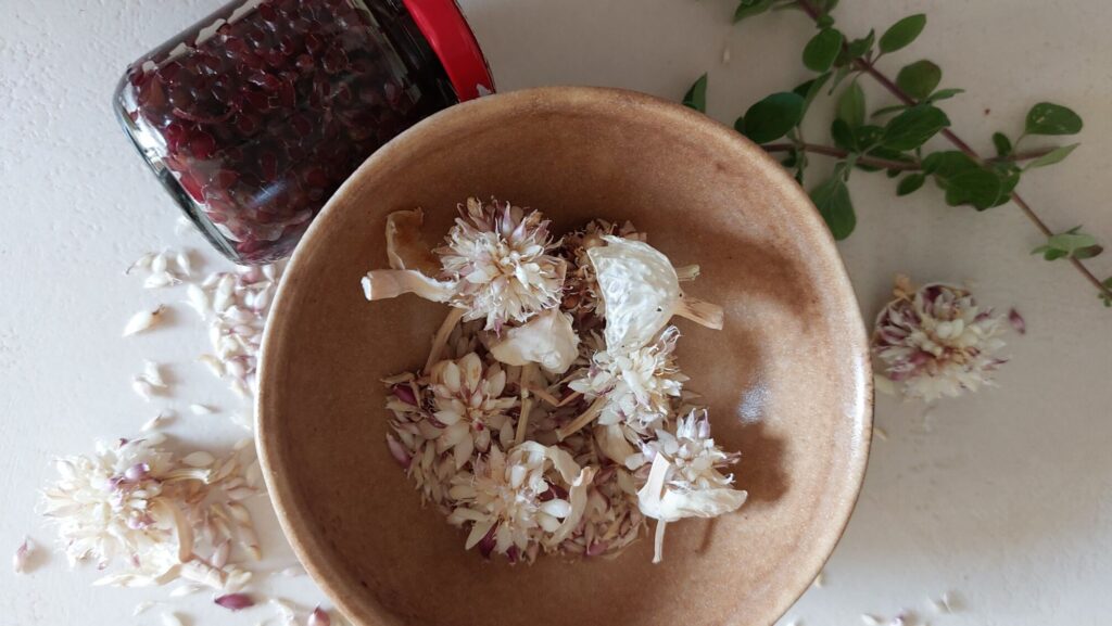 Pri prechádzkach prírodou koncom leta môžu vykúkať vysoko nad trávou hlavičky divokého cesnaku. Pozbierajte ich a skladujte na vzdušnom suchom mieste. V mištičke na kuchynskej linke mi vydržia do ďalšej sezóny. Pridávam ich na spestrenie a dekoráciu pokrmov. Ak sa vám náhodou rozkotúľajú po záhrade, môžu sa tam udomácniť, ako aj u nás. Chutné sú lístky aj kvietky.